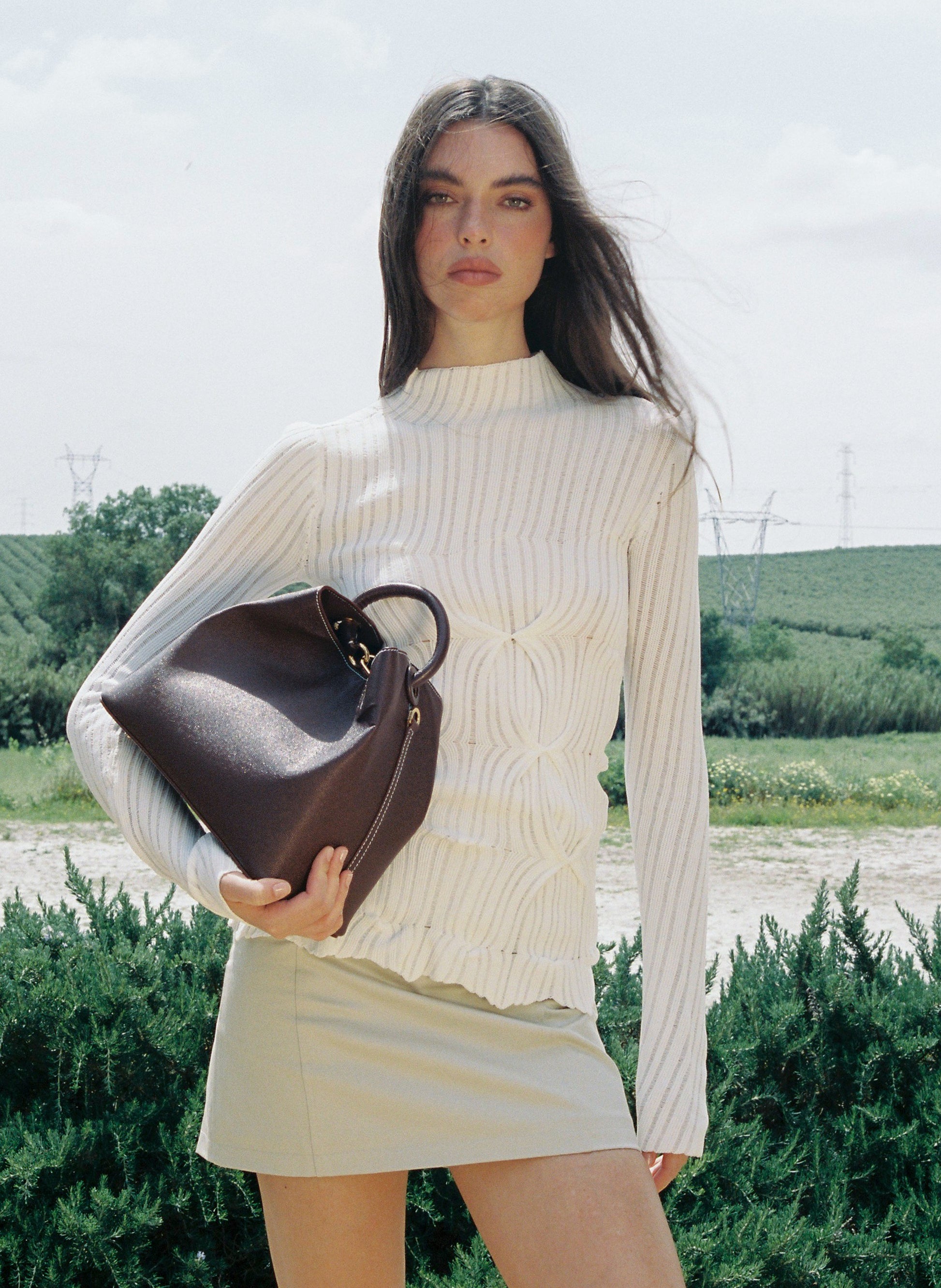 Présenté dans la collection inaugurale d'Elleme, Raisin est un modèle intemporel caractérisé par sa forme organique, sa poignée supérieure cousue à la main et son élégance discrète.