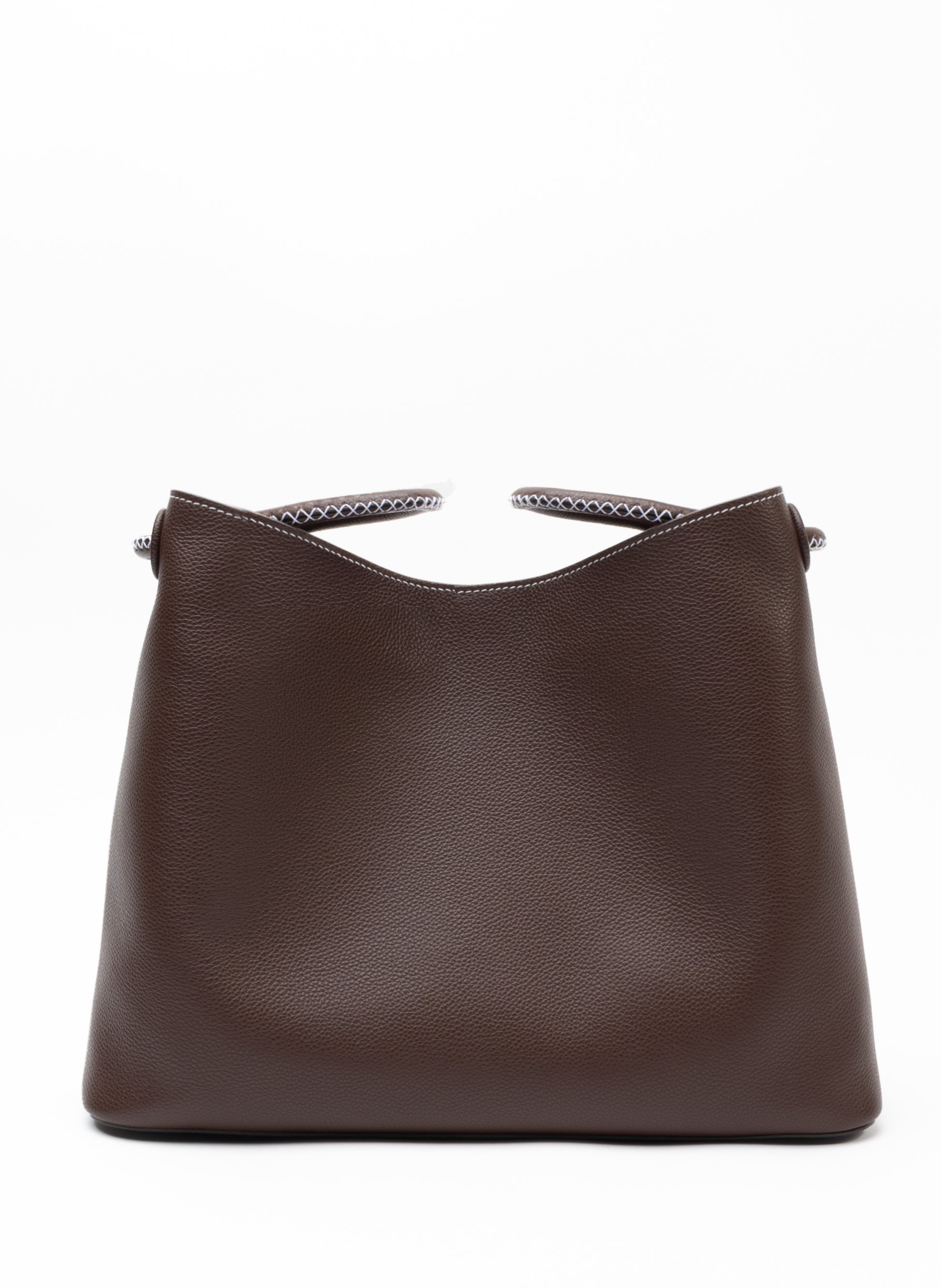 手縫いの革製ハンドルが2本付いた大型のトートバッグ。